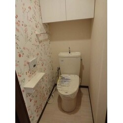 もともとの収納は残し、棚やドアのみ追加交換して収納力を高めました。チャーミングなトイレはご家族のお気に入りです。