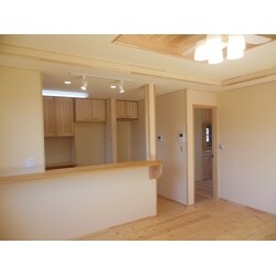 リビングとキッチンを繋げ、対面キッチンに 床材は赤松材を使用しました。
