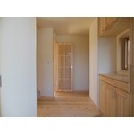 玄関は赤松材 玄関収納も赤松、中身は桐材です。
