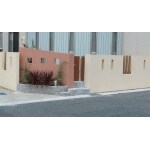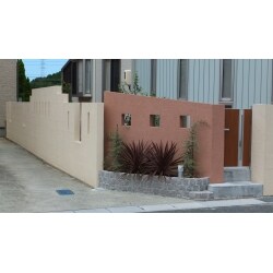 新築後、家と敷地がぎりぎりの為塀をついて圧迫感がないような仕上がりをとのご要望でしたので、予算を考えてすべてブロック塀と手塗のコテ仕上げでポイントを2色でコーディネートしております。道路側正面に花壇をつけピンコロ石を貼りました。