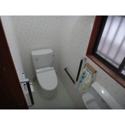 和→洋のトイレ取替えと内装改修です。 和式便器の上に簡易洋式便座を取り付けてのご使用でした。今回は洋式の節水トイレに取替えです。内装は、床と壁はタイル貼り(一部木板)、天井は石膏ボードだったものを明るい花柄の壁紙とクッションフロアに張替です。 また、床の段差も無くしてフラットな状態にすることで、より安全に使用出来るようリフォームしました。 以前のお手洗いに比べて、より使いやすく清潔な印象の空間に生まれ変わりました。