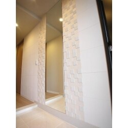 新築マンションですので綺麗でしたが、どこか殺風景な雰囲気に物足りなさを感じられていた奥様。 そこでモデルルームにもあった鏡とエコカラットを取り付けたいと、ご希望されました。 モザイク調のエコカラットはショールームにて一目惚れしたもの。 鏡の幅やタイルの割付を何プランか作成し、何度もお打ち合わせさせて頂きました。
