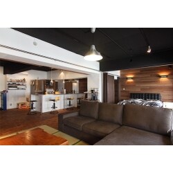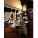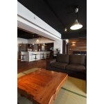 (旧株式会社ダイチでの事例です。)既存の間取りは小さい部屋が連なる3LDK+納戸でした。この間取りをスケルトンリフォームにより、大胆にワンルームをご希望。コンセプトは友達が気軽に集える大空間でした。そのためにこだわられたのがキッチンで、「みんなでパーティを盛り上げるアイランドタイプを取り入れたい、木とメタルははずせない」ということで、キッチン本体はご自身が調達され、それに付属させるカウンターはステンレスで造作により仕上げました。スタイリッシュなこのキッチンを中心に周囲にリビング、ベッドルームなどを配し、開放感溢れるハイセンスな空間が実現しました。 間取りだけでなくインテリアにもこだわり、壁は白、そして天井は黒というシャープなモノトーンで仕上げました。