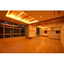 テナントビルのワンフロアをオーナー住居としてコンバーションした事例です。 住居に必要な設備費用は不可欠でしたが、空きテナントの有効活用はお客様のメリットになりました。 事務所ビル特有の立地で大きな開口が設けられており、住空間としてのプライバシーを確保しつつも採光を取れるように透過性のある収納扉をダブルスキンのように配置しています。