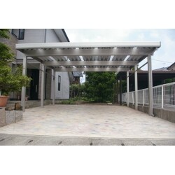 パネルカーポートから折板カーポートに建替し、お客様のご希望で一般的な土間コンクリートではなく、色柄を入れたデザインコンクリートで仕上げました。 カーポート屋根は全体的に明かりが取れるようにポリカ折板を入れたので、デザインコンクリートも映えて、お洒落に仕上がりました。