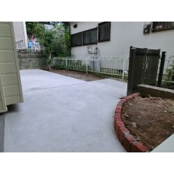 雨の日は靴底についた泥で玄関が汚れていましたが、土間コンクリートを打設して解消しました。 また、アクセントでレンガを使用して花壇を設置しました。