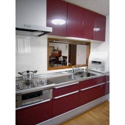 ワインレッドのキッチンにしたい!とリフォームを決意されました。特徴的なデザインのフラットライン取手がキッチンの雰囲気に良く合っています。 コンロはノーリツのS-Blinnk ADVANCE。液晶と音声で多彩な料理サポートをしてくれるかも!?