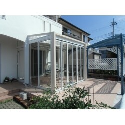 施工後です。 外部床も土間にコンクリートを打設し、テラコッタ調のタイル を施工したことで、サンルームとのつながりがあり、広々とした印象になりました。