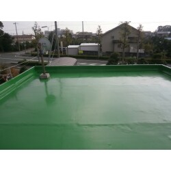 絶縁シートの上にウレタン塗膜防水剤を2回塗り、その後緑のトップコート処理して完成です。トップコートの色はグレーもあります。