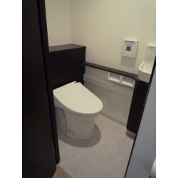 若いご夫婦のご希望で、白とこげ茶を基調としたスタイリッシュなトイレのリフォームをさせて頂きました。 マンションリフォーム用のトイレで手洗い器を手前に付けられるタイプを選ばれ、機能的にも今までよりもずっと使いやすいものになったと思います。 トイレの雰囲気に合わせて内装材のコーディネートもご提案させて頂きとても喜んでいただくことができました。 (トイレ内装工事込みで35万円)