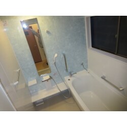 新しいお風呂は防寒に優れ足元も滑りにくいユニットバスです。 窓はフリー窓枠+アタッチメントで対応。 浴室内のカラーは、ホワイトを基調にブルーグリーンのアクセント壁でとてもさわやかな印象に。