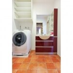 暗く雑然とした雰囲気だった浴室やトイレなどの水回りをテラコッタ調のフロアで統一することで、すっきりとシンプルに生まれ変わった洗面所は、使い勝手も格段にアップしました。選択には井戸水を活用することもできます。洗面所、勝手口、キッチンがほぼ一直線上にあり、家事導線にも考慮しています。