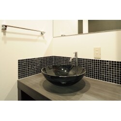 築80年の古民家の蔵を、現在のライフスタイルに合うように再生しました。和の趣を残しつつ、利便性と快適性を追求するリフォームを行いました。トイレ前の木製洗面台には、ご主人の要望でシックな黒いガラス製の手洗いボウルをセレクト。壁には、黒いモザイクタイルをあしらいました。和モダンな空間が蔵の雰囲気によく似合います。