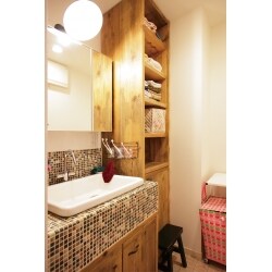 ブラウンやオフホワイトなど、木の温かみにマッチする色合いを絶妙なバランスで合わせたモザイクタイルで、洗面台をセンス良くデコレーションしました。洗面台横の造作の木製棚は、フェイスタオルやバスタオルを分別して収納できます。空間を演出するとともに利便性も向上させた洗面室となりました。