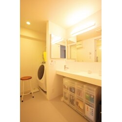 脱衣・洗濯スペースと洗面台の間に小さな仕切り壁を設け、空間に奥行き感と明るさをプラスしました。スムーズな導線が確保できるように、利便性を重視して幅広の洗面カウンターと多面鏡を採用しました。洗面台下の空間にはあえて何も造らず、自由に配置できる収納ボックスを置いてスペースを有効活用しています。