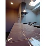 状態の良かった既存のキッチンはそのまま利用することにし、上部の吊り戸棚と下がり壁を撤去。リビングとの一体感を強くしました。 スイッチやコンセントの関係で一部残った壁にはタイルを貼ってアクセントに。壁にタイルを貼るならキッチン前のカウンターにも使用してみてはと弊社からのご提案を採用頂き、とても可愛らしい仕上がりとなりました。