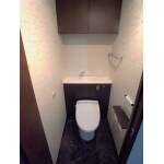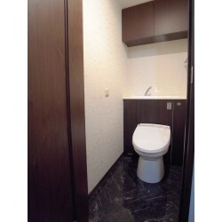 既存の吊り戸棚は再利用し、トイレと色を統一するために表面をシート張りしました。