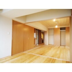 【施工後】個室の間仕切り壁を撤去し、左側に見えるLDKとの間に新たに建具を設けた様子です。手前の空間は個室にも、リビングの一部にも使えます。