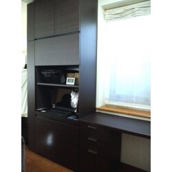 出窓や梁にもサイズピッタリに納まり、大満足です。パソコンデスクの下は可動式のイスになっており、テーブルのあいているスペースにもピッタリ入るようになっています。一番気に入っている点は、左の細長い所にワイパーなどの掃除道具が一式入れられるところです。