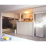 (旧東京ガスリモデリング株式会社での事例です。)大きなテーブルをゆったり置けるように、寝室に置いていたベッドを奥の部屋に移動。既存のL字型キッチンは撤去して、配置替えしてI型のシステムキッチンを新設しました。腰痛をお持ちのお客さまの負担を軽くする為に、サービスカウンターの高さを設定し、コンロ部分は一段低くし作業しやすくしています。 また、重い調理器具を取りやすいよう、大きな引出しを採用するなど配慮しました。既存のキッチンのあった場所には洗濯機を置き、家事の効率性をアップ。また、収納を多く確保するため、窓下や間仕切りを兼ねた収納家具を造り付けています。