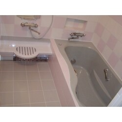 【施工前】ご両親が建てた家の、旅館のような浴室を、新しく使いやすい浴室にとリフォームされました。浴槽のまたぎが低いため、洗い場の水が浴槽に入ってしまい、苦労されていました。