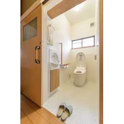 ドアは引き戸にし空間を広げることで出入りがしやすくなりました。また、段差をなくし手すりを設置したことで歩行の際も万が一車いすを使用する場合にも安全に利用することができます。明るい印象のおトイレになりました。