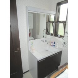 三面鏡の洗面化粧台でスッキリ収納。茨城県石岡市でリフォーム。