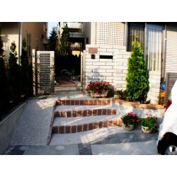 「既存の外構では、自転車を駐輪するスペースがない。門扉内に駐輪したいが、スロープが無いため、自転車を運びこむのが難しい。」とのお悩みでした。 既存の植栽スペースを丸く削りとり、階段位置をずらし、自転車用のスロープを設置し、門扉内に自転車を駐輪するスペースを設けました。雨の日でも滑りにくいよう、スロープと階段には、洗い出し風仕上げのストーンフィーネを利用しています。門扉から玄関ドアまでのアプローチは、ピンク系の乱形石貼とし、新規照明を設置しました。 既存の外構は、グレー系で統一したシックなイメージでしたが、赤いレンガや曲線を利用し、照明を配置することで、イメージもかわいらしく一新することができました。門扉外に植えたシンボルツリー「ヨーロッパゴールド」も喜んでいただけました。