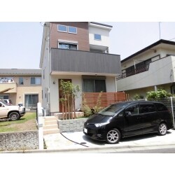 コンパクトにまとめて、スッキリした外観の中にも機能、使い勝手を充実させた外構になりました。駐車スペースの奥にはウッドデッキと目隠しフェンスがあり、風と光は通りながらも前面道路からの目線は遮るようにレイアウトしています