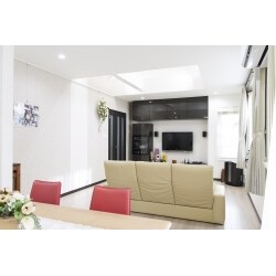 中古の家を購入する際、一日の時間で多く居るリビングの暗さを気にしていましたが大きな吹抜けをプランに取り入れ、明るい空間になりました。 ワンちゃんの事も考え、調湿と消臭力のあるエコカラットも採用。 エコカラットは吹抜け上の天井部分まで貼っているのでお部屋のアクセントにもなっています。 耐震補強もして地震にも安心な住宅になりましたが、その耐震補強の見せる筋交いも素敵です。 お花が好きな奥様を想いながら、お家づくりをしたご主人様は男の鏡です!
