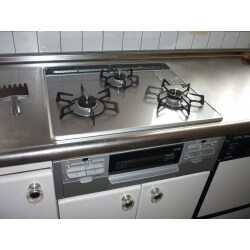 当初はシステムキッチン入替えをご希望でしたが、キャビネットやシンク・天板はまだ傷みも少ないので、ガスコンロとレンジフードのみを入替えさせていただきました。新品のキッチンみたいに綺麗で使いやすいキッチンになりました。 ガスコンロはホーローからガラストップに換わりとてもお掃除がしやすく、水なし両面焼きグリルと温度調節の機能がついているタイプなので調理が簡単と大変喜んでいただきました。