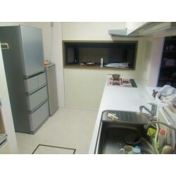 元々は、L型のキッチンをご使用されていましたが、内蔵型のオーブンが不要で、広く使いたいとのことでしたので、I型のキッチンに替えました。洗面室の内装改修と合わせて、内装材には調質性のある素材を使用致しました。