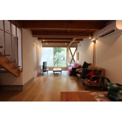 中古物件のリフォーム。土間や木格子の吹き抜けがとても素敵に仕上がった。若いご夫婦にあったオンリーワンの空間。