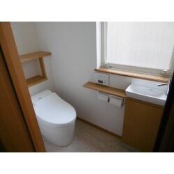 「お掃除のしやすいトイレに替えて、できれば手洗を別に設けたい」とお願いしました。 タンクレスのトイレにして、手洗器もきれいに納めてもらいました。手すりの取付も考えたのですが、大きめの窓が付いていて、窓を除けて取り付けても使いにくいものになってしまうとの事でしたので、手摺代わりになる棚付の紙巻器を取り付けました。