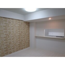 1面のみ、レンガ調のクロスをご提案しました。全体のホワイトをメインとしたデザインと良くマッチしています。