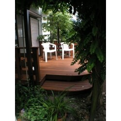 既存のウッドデッキが朽ちていたので、新たにウッドデッキを施工しました。材料にはセランガンバツーを使用し、キシラデコールで塗装しています。 「日当たりが良いので、デッキで過ごす時間を増やしたい。そのため、新しいデッキは既存デッキより広くしたい。」とのご要望でしたので、可能な限りスペースを広げました。デッキの出隅部に植栽がありましたので、その部分はデッキをアールに切り取り、ステップとしています。アールのデザインを生かしつつ、スペースを最大限に有効利用したデッキが完成しました。