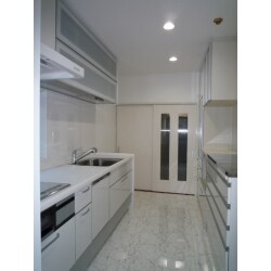 クリナップ クリンレディを採用。システムキッチンにあわせ、壁・建具・床をホワイト調で仕上げました。床材に鏡面調の床材(石目調ビアンコ柄)を使用し、ライトをダウンライトにすることで、キッチン全体に高級感が加わりキッチンが一新いたしました。