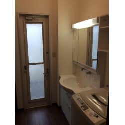 洗面化粧台とクロス・クッションフロアー貼り替えを施工させて頂きました。