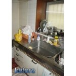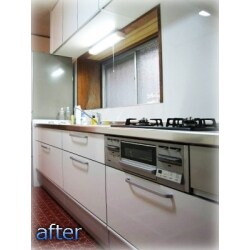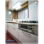 【工期】3日、【金額】78万円、【仕様】クリナップ クリンレディ 中古物件を購入された若いご夫婦に、お母様がきれいなキッチンをプレゼントしたいとご依頼いただきました。 汚れがとれにくいタイル壁、油が溜まって不衛生な換気扇・・・そしてなにより無駄に長く、天板に継ぎ目のある組合せ式の流し台。 これがキッチンを狭く窮屈にしていました。今回、ステンレスを採用したクリンレディを導入し、思い切って少し短い2.55mにしました。 短くしたことで冷蔵庫の配置も変わり、食器棚のスペースも広がりました。作業導線も改善され、快適なキッチンに仕上がりました。 お料理上手なご主人も、生まれたばかりの赤ちゃんを見ている奥さんのために腕を振るうとおっしゃっていました!