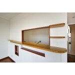 銘木の飾り棚や木製の室内窓で個性が光るリビング空間