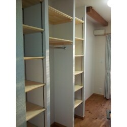 お子様の成長に合わせ、それまで一つだった部屋を間仕切り収納で2つに分けました。既製品の家具収納ではないので、お客様のご要望をお聞きし、弊社の大工で壁を立てて、可動棚を設置しました。