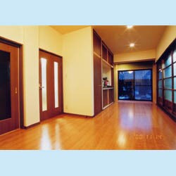 玄関ホール正面に掃き出し窓を設置、中庭の緑と風を取り入れた、開放的空間を実現しました。また、応接室(接客スペース)、食事室(団欒スペース)を独立させ、空間に区切りをつけました。また、ユーティリティは、台所とつなげ、食品庫、作業カウンターを設け、家事能率をアップさせました。台所は奥様のあこがれの対面式カウンターを設置し、会話がはずむ空間を実現、また台所から仕事部屋をつなげ、炊事の能率もアップさせました。洗面脱衣室も大きくとり、生活雑貨類がたっぷり収められる全面鏡戸の収納を設置しました。