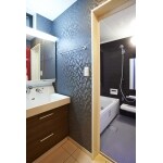 (旧東京ガスリモデリング株式会社での事例です。)ダークグレーのクロスでまとめた洗面室。写真では見えませんが、左側の壁に既存の収納を埋め込むことで、広い脱衣スペースを確保しています。