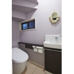 (旧東京ガスリモデリング株式会社での事例です。)リビング同様に床に大理石を採用したトイレ。壁には薄い紫のクロスを採用し、落ち着いた雰囲気を創出しています。
