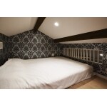 (旧東京ガスリモデリング株式会社での事例です。)クラシカルな模様のクロスが目を惹く、リビングの頭上に新設したロフト。空気が循環し、下にいる家族の気配もわかるように、壁に格子を取り入れています。天井を開けると梁が出てきたのをきっかけに「デザインに活かしたい」というお客さまのご要望に、ロフトの床を下げ、ゆとりある天井高さを確保してご提案しました。