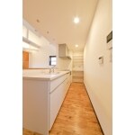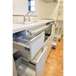 ご家族とのコミュニケーションが取れるようキッチンは対面式を提案。デットスペースを活用し収納棚を設置。