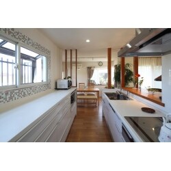 独立していたリビング・ダイニング・キッチンを、ワンルームのLDKへと間取り変更。キッチンを囲む柱は構造上残し化粧柱に。この柱の間にシステムキッチンを配置、キッチンを中心としたLDKに。 寒さ対策として自然光が入りやすく工夫し、断熱材を入れ、二重サッシにしました。