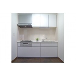 開き扉のセットキッチン、奥まったキッチンは暗い印象に。