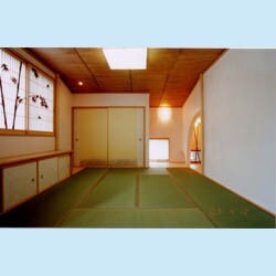 2F畳の間は娘さんの部屋、写真正面へ1間増築したことによって、天井に勾配が出てくること、床の間の部分が構造上下がってくることを隠さず逆らわず、デザインに取り込みました。 壁は、和室のイメージにとらわれず漆喰に紅をまぜて、ピンク色に仕上げました。光が入ると壁に反射して柔らかくやさしい部屋になると喜んで頂きました。1F居間も漆喰壁で簡単な間仕切はパネルドアを取付。畳は、薩摩葦の天井とデザインをあわせて正方形の縁なしで仕上げました。構造的に、安全性を重視し、構造計算を行い大きなスパンを確保しました。