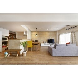 無垢フローリングと古レンガ調タイルで憧れのカフェ風リビング